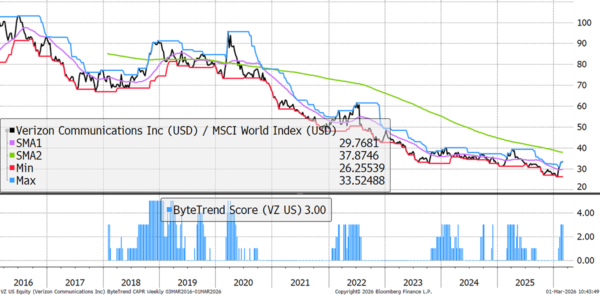 These stocks are trading at the 30-week CAPR lows with a ByteTrend Score above 0. They are weakening trends but not yet downtrends. All charts shown are CAPR rebased to 100.