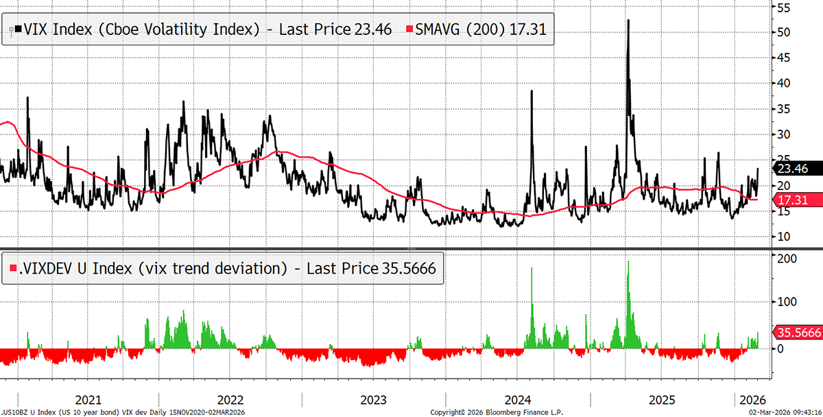 The VIX jumped over the weekend but has been rising for several weeks. No doubt this will rise further today; the question is how long it will remain elevated.