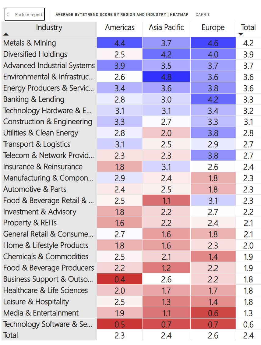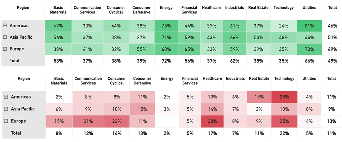 Energy remains strong across all regions. Property and REITs continue to strengthen, especially in Europe.