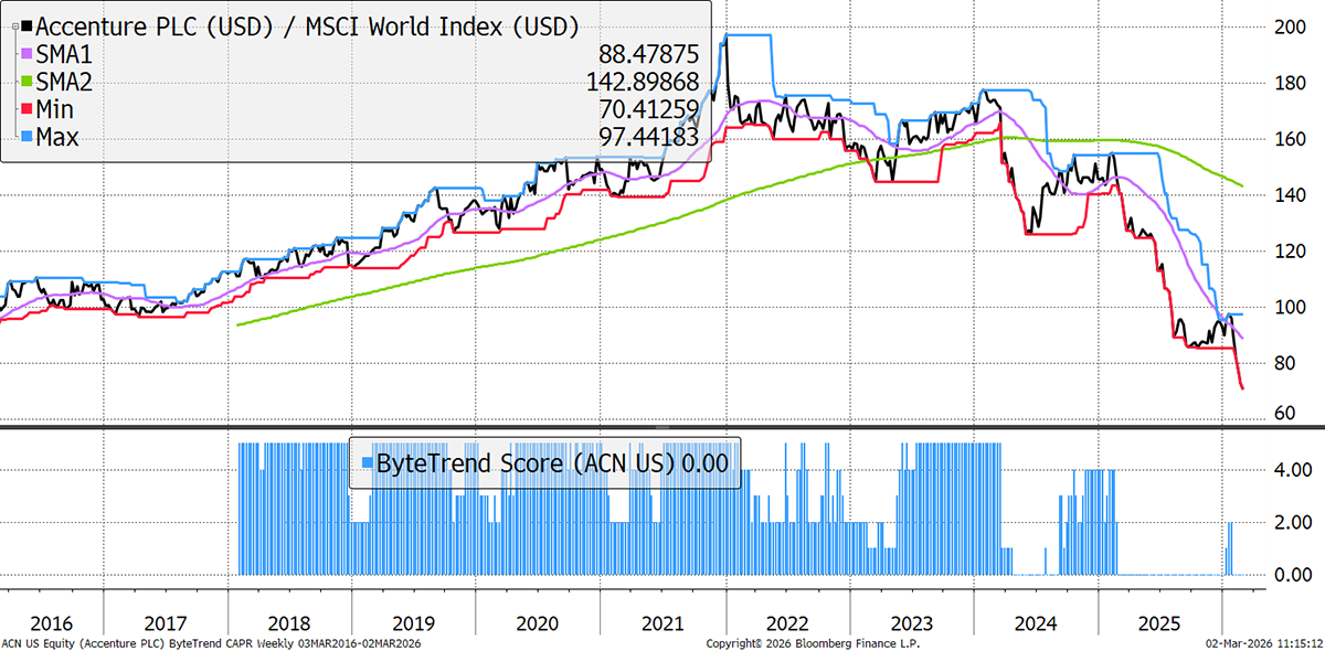 AI is like a free consultant. The Big Four, and others, are desperately trying to learn how to co-opt this incredible tool to avoid being replaced by it. The uncertainty of success is what’s leading these declines. Labour-intensive, white-collar companies are firmly in the sights of AI disruption fears. Some may survive, even thrive, but the market is shooting first and asking questions later.