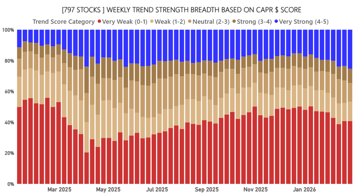 These stocks are trading at the 30-week CAPR lows with a ByteTrend Score above 0. They are weakening trends but not yet downtrends. All charts shown are CAPR rebased to 100.