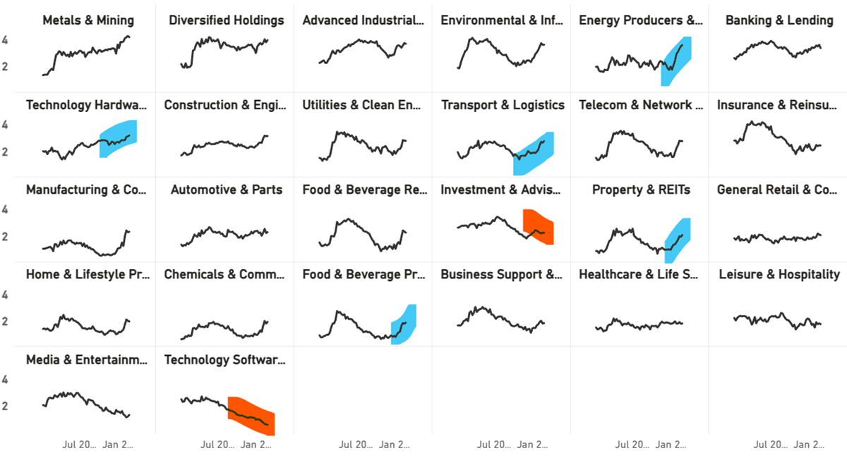 In Asia, Chemicals and Commodities continued to improve, and Media/Entertainment stocks continued their decline. Construction and Engineering also maintained their upward trend, as did Transport and Logistics.
