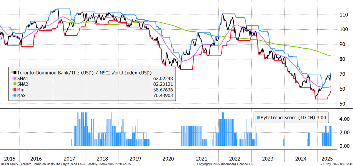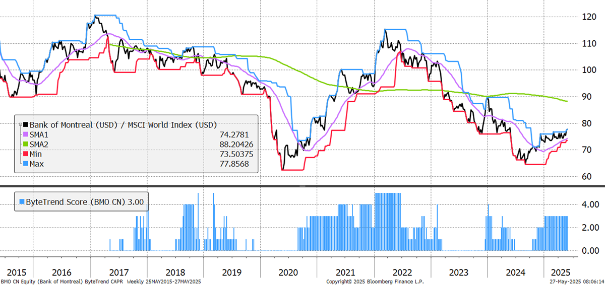 Canada’s Bank of Montreal (BMO) presents a very different chart to TD. Notice how it has made a higher low in CAPR since the pandemic, suggesting BMO has faced fewer pressures in recent years compared to its rivals.
