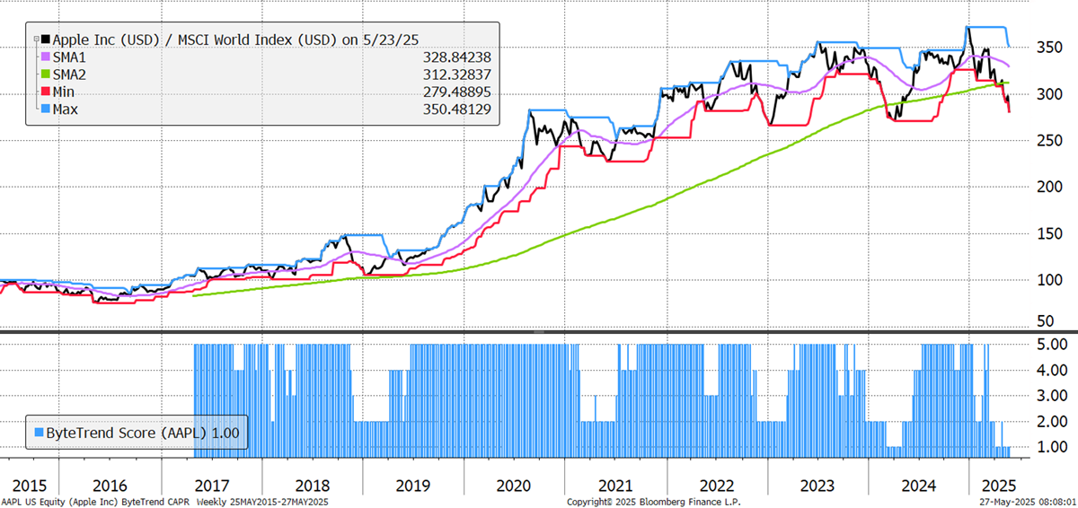 Apple is still one of the largest companies in the world. However, heavy exposure to US-China trade tensions, with potential tariffs threatening up to a 25% downside to earnings if exemptions are lost (costs that could reach $900 million in a single quarter). Its supply chain remains highly concentrated in China and Taiwan, and Trump has criticised its suggested expansion into India too. Delays in key innovations, such as generative AI, further cloud its growth prospects and raise uncertainty about maintaining its historical pace of outperformance.