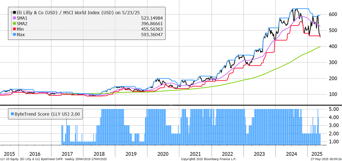 These stocks are trading at the 30-week CAPR highs with a ByteTrend Score of 5. All charts shown are CAPR rebased to 100.