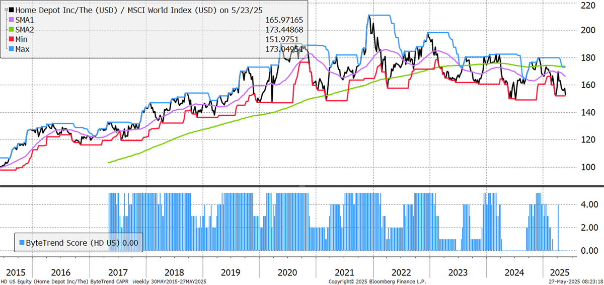 These stocks are trading at the 30-week CAPR lows with a ByteTrend Score of 0. They are in a downtrend. All charts shown are CAPR rebased to 100.