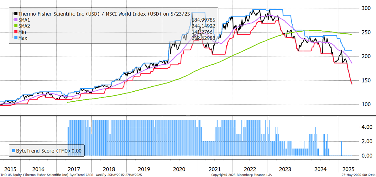 Thermo Fisher keeps appearing on the bear list. Its products range from lab instruments and chemicals to advanced genetic testing tools, and it supports everything from basic research to large-scale drug manufacturing. Revenue and earnings showed only modest growth in Q1 2025. Free cash flow declined significantly, while capital deployment included a major acquisition. It cut its profit forecast due to higher costs from tariffs and weaker research funding, especially in China and Europe. This won’t do for another overvalued company.