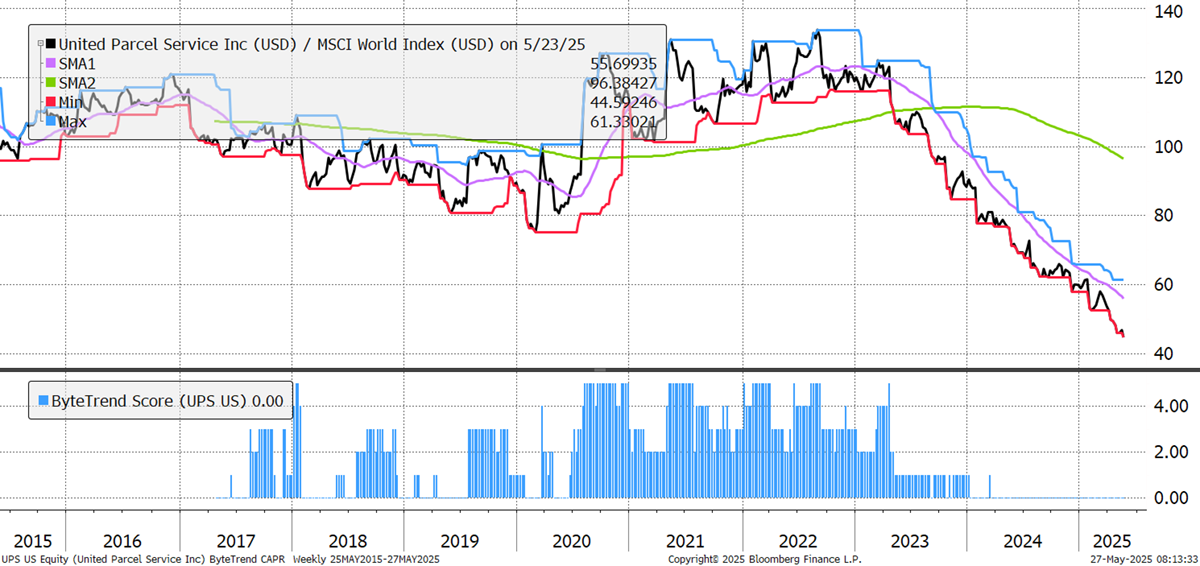 UPS generates 75% of its revenues in the US, and half of it from ground transport deliveries. In Q1, revenues declined again, and its transformation initiatives and cost-saving programs are adding significant one-time charges, which impact GAAP results. Higher labour costs and slowing deliveries following the Covid-boom have mounted a dual challenge to its financials, exacerbated by Amazon’s continued development of its own logistics. The costs of investment needed to keep up look like a heavy weight on the next few years too, hence the persistent underperformance.