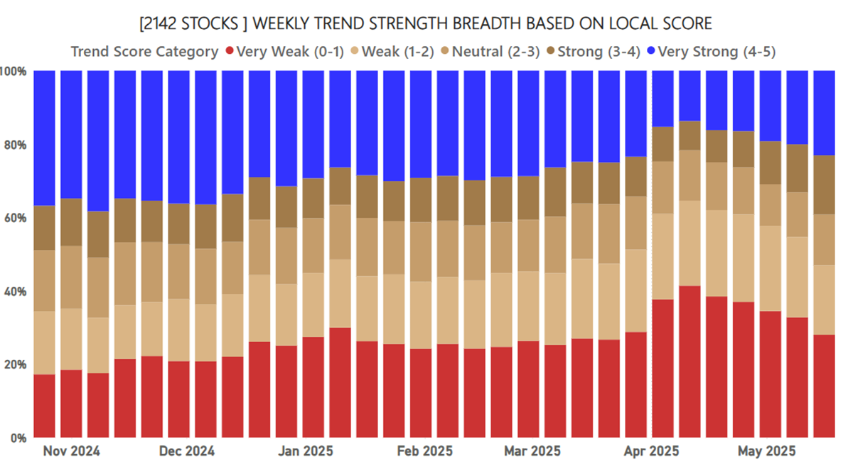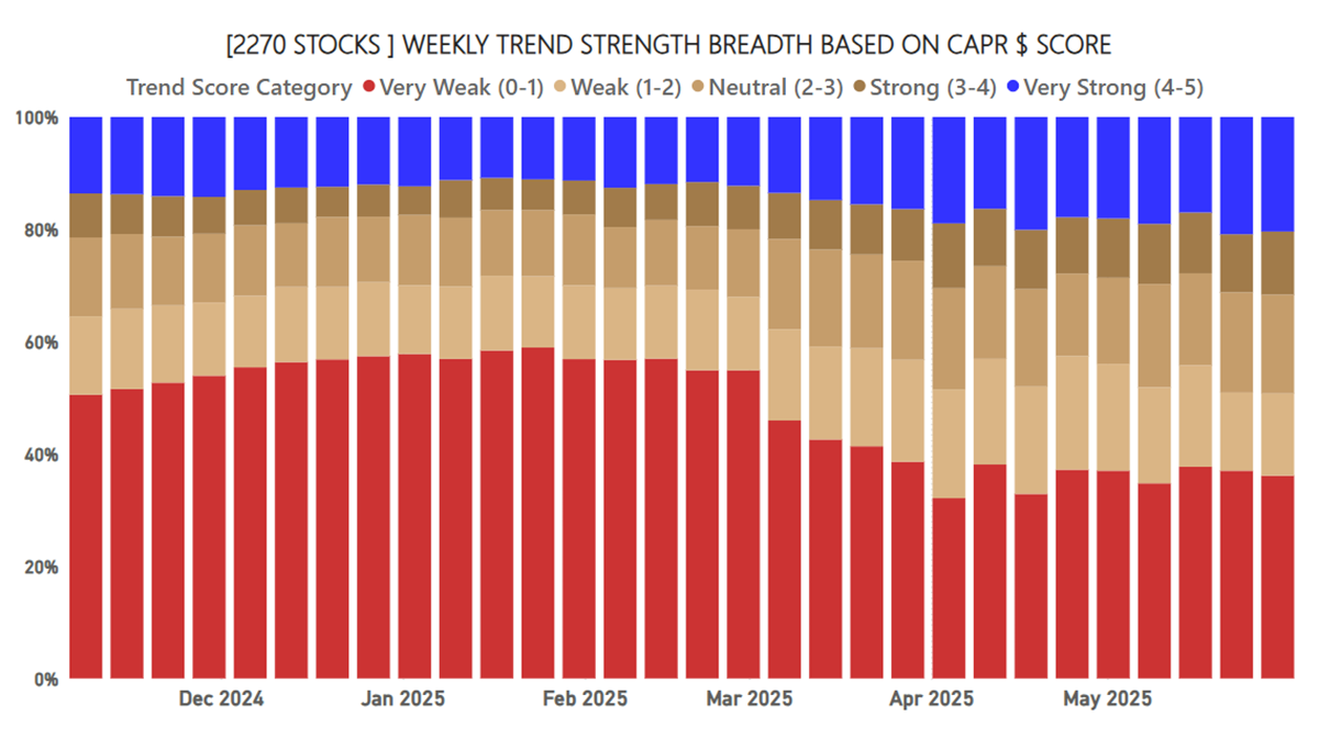 I show the same data in CAPR as opposed to local currency. There are fewer strong trends, but the number is growing. This demonstrates that the ultra-large stocks are no longer driving the market, but rather a larger number of other large stocks.