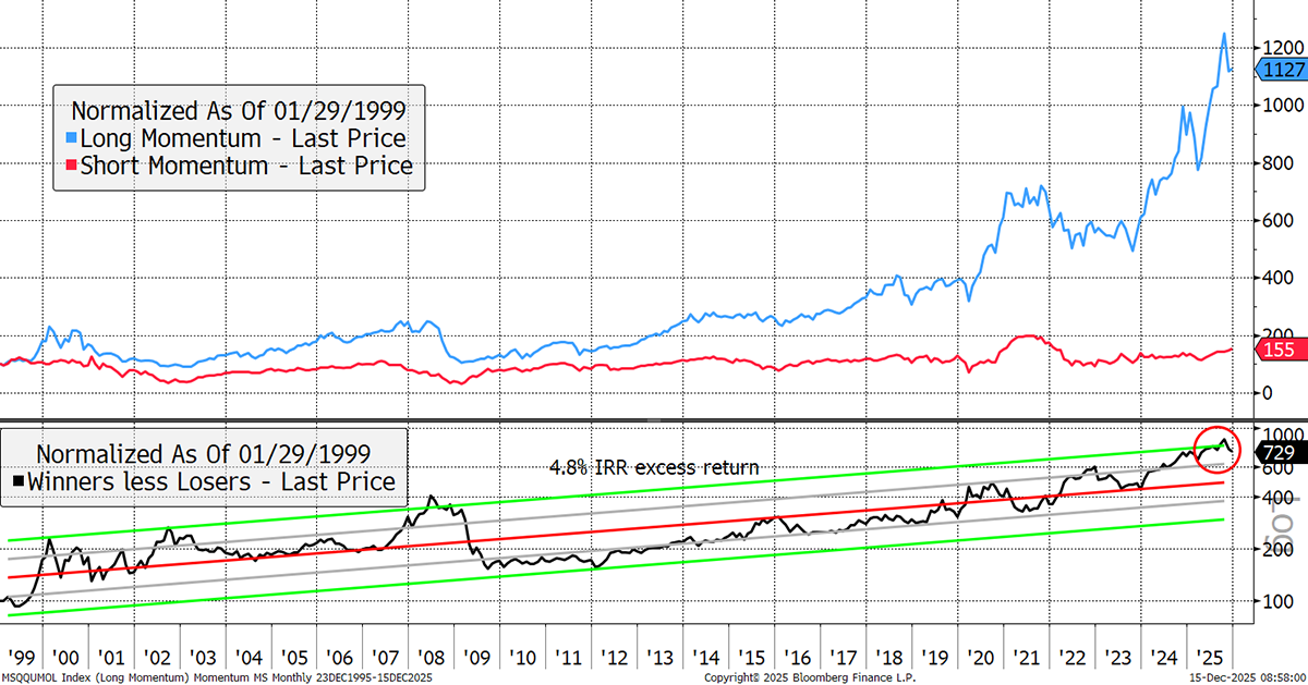 Past winners have beaten the losers by 4.8% p.a. over 25 years. The momentum line was recently two standard deviations above the trend and is starting to retreat. We do not know how this will play out, just that it will. It has the potential to be disruptive and potentially painful for markets. A momentum retreat will favour value over growth.