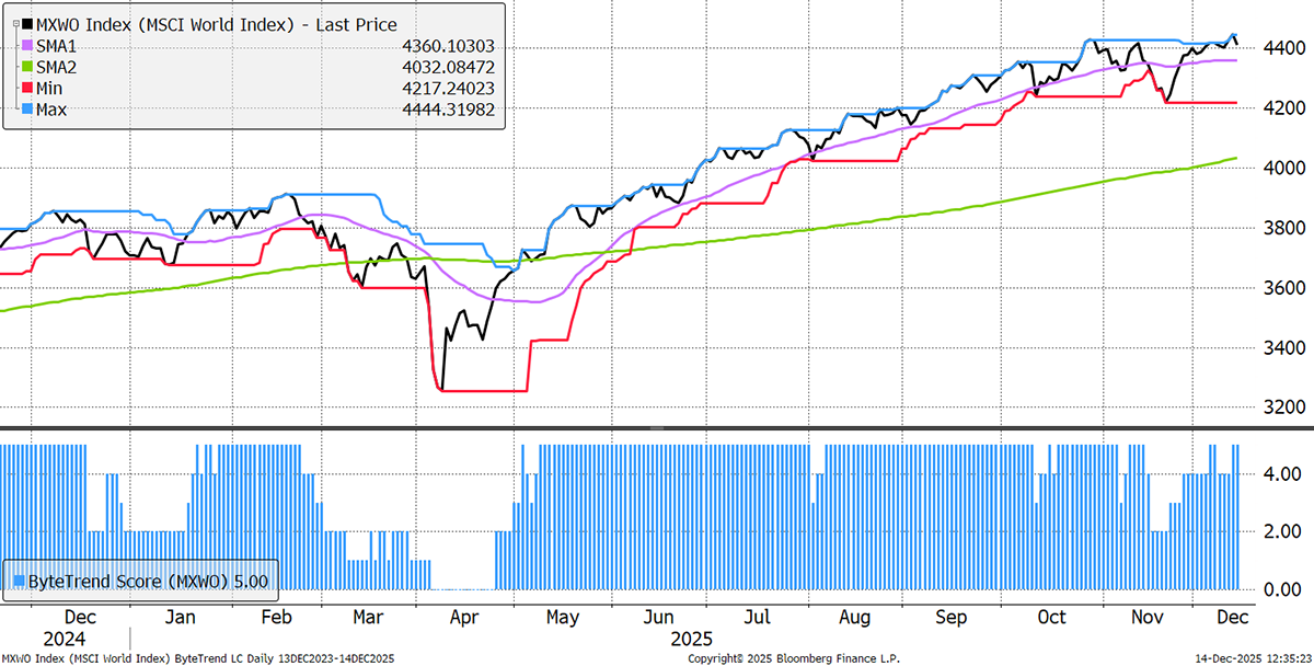 The World Index regained a ByteTrend Score of 5 and made a new all-time high. The pace has slowed, but never mock a new high.