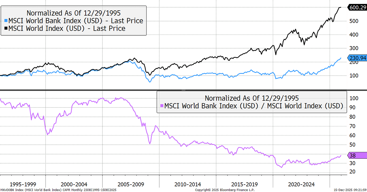 Banks are strong on this week’s list. It’s easy to forget that the banks are in a privileged position in the economy, where they sit at the top of the food chain, with the ability to not only print money but also get a slice of all transactions. They have lagged the world since 2007, and although they have had a great year, this recent outperformance still has a long way to go.