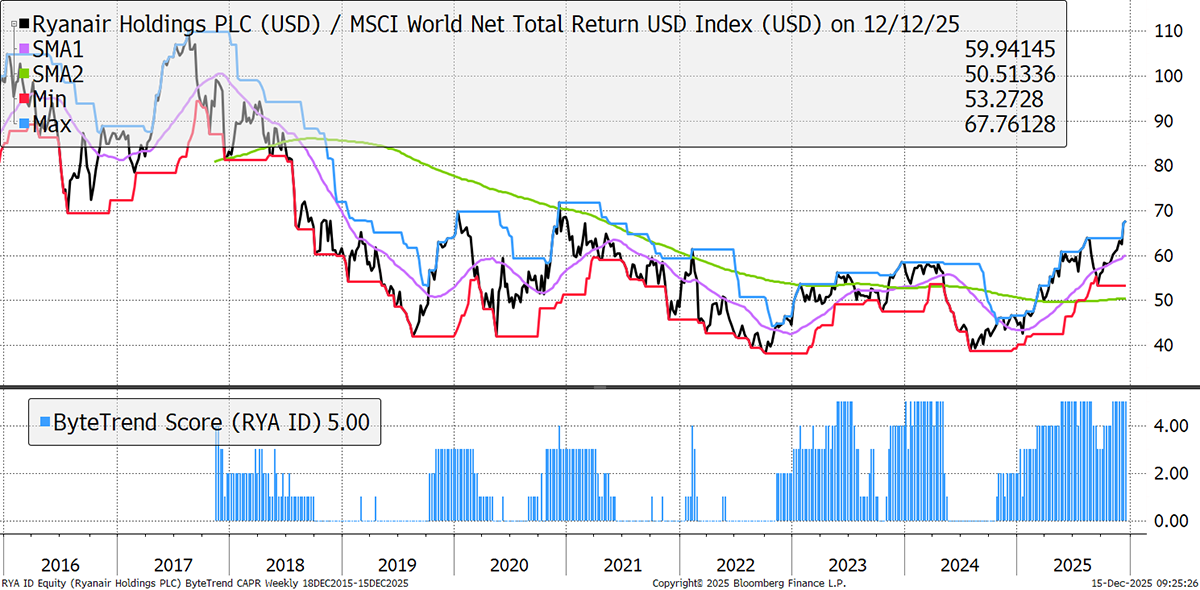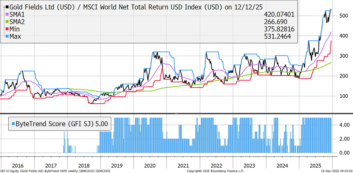 These stocks are trading at the 30-week CAPR highs with a ByteTrend Score of 5. All charts shown are CAPR rebased to 100.