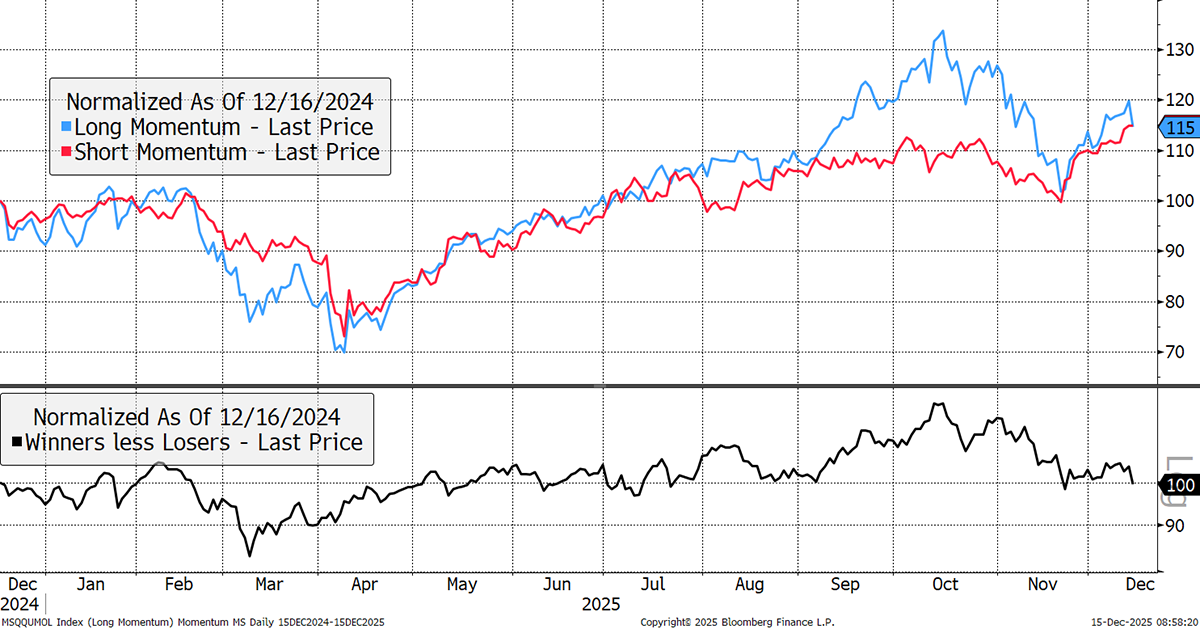 Checking in on the momentum indices, the past winners (blue) have rallied and reversed last week, while the past losers (red) have gained. The momentum line (black) has eased back.