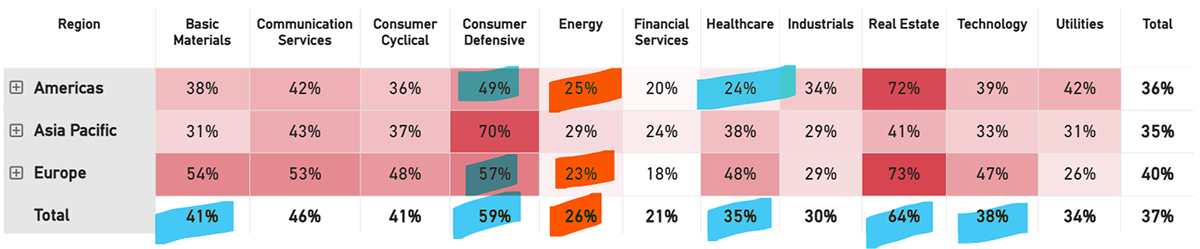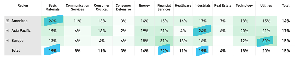 The world’s strongest stocks comprise 15% of all stocks, which are in trends that are beating the market. Not shown is that 41% are “going up” in local currency terms, but they are not necessarily beating the market. Basic materials, financial services, and industrials are stronger than last week, but the overall list remains similar.