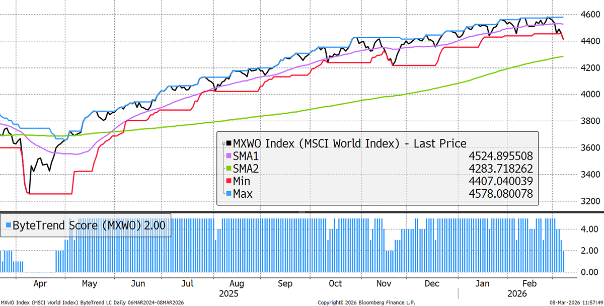 The World Index is falling from a previously strong position. The prevailing strength in energy and materials continues, with tech a short-term safe haven. Non-US markets give up their relative gains. VIX trends are rising, and this correction may have further to go until the Straits of Hormuz restore safe passage. To add to that, private markets display signs of stress.