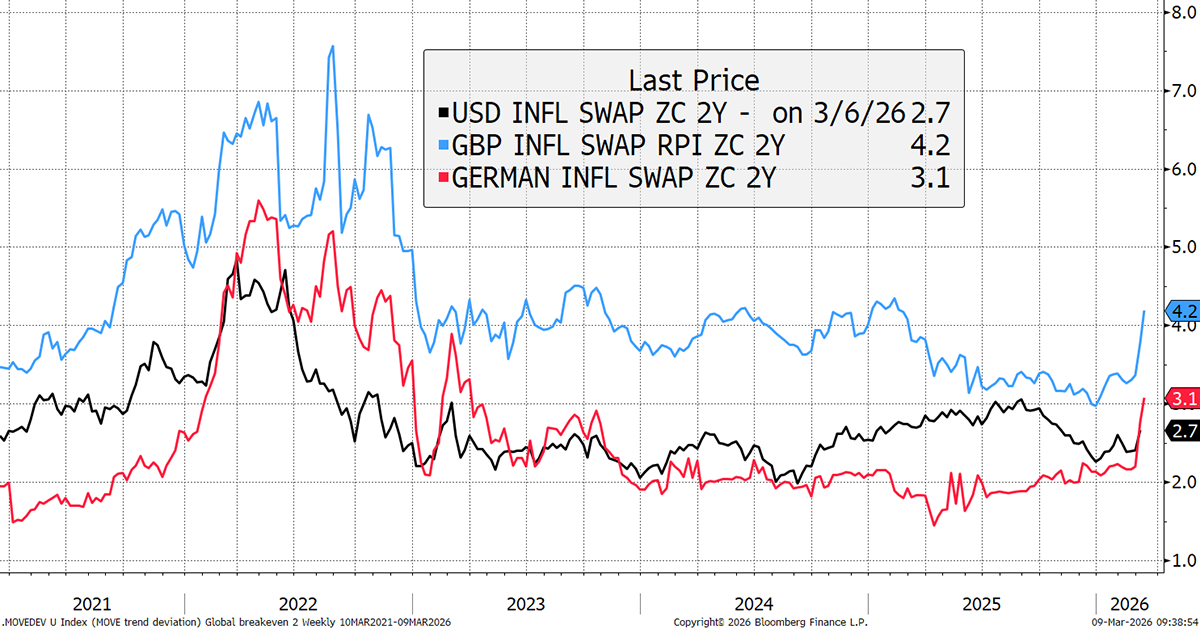Breakevens, inflation expectations, have risen with the oil price.