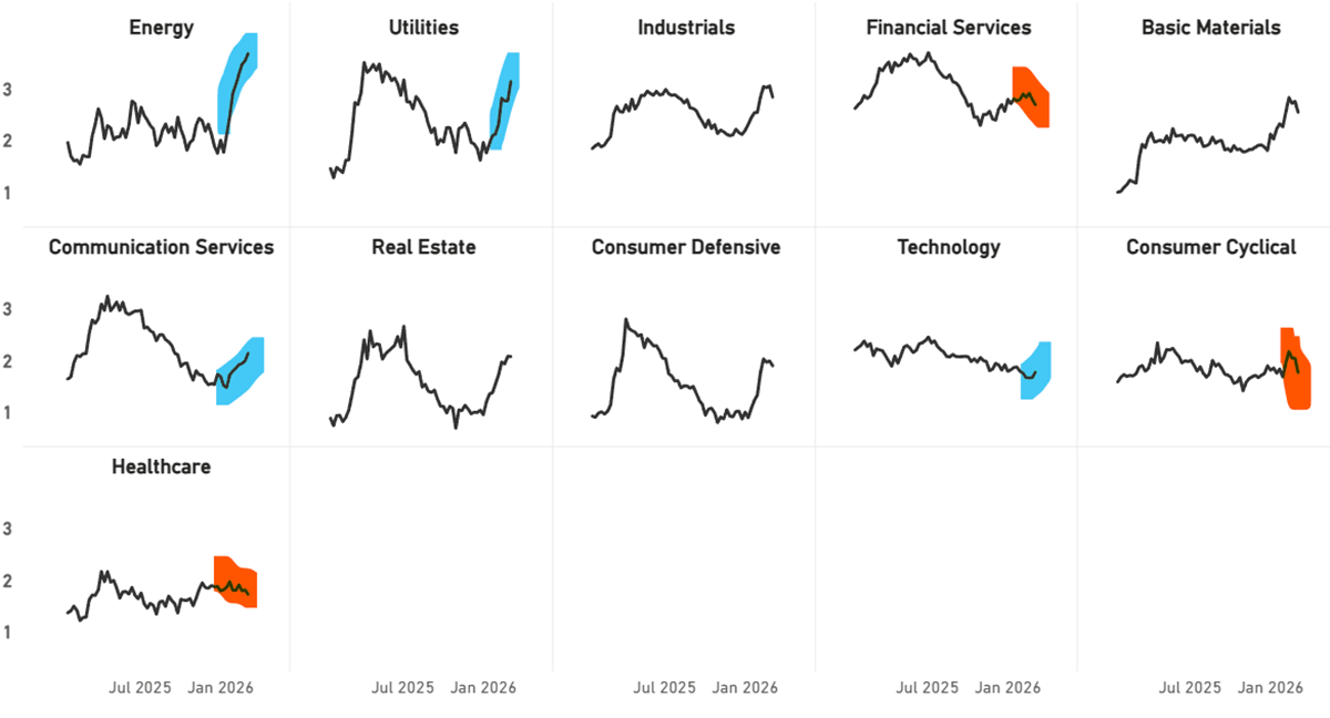 Of the strong trends, only Energy Producers and Utilities & Clean Energy are up in recent weeks. Food & Beverage Retailers also rose slightly this week, while Media & Entertainment are back on the up as Netflix has reversed sharply higher following the news that it had stepped away from the Warner Bros bidding war. While Tech Hardware dipped, Software managed a slight rise, as it was oversold and is less impacted by the physical impacts of war and rising energy costs. However, it remains the weakest industry.