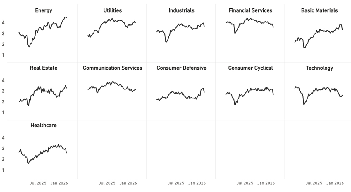 Energy is the most defensive sector alongside Utilities. Finance, Cyclicals, and Healthcare have turned down. Technology is stronger, which is a notable change. The virtual world has its advantages during times of war.