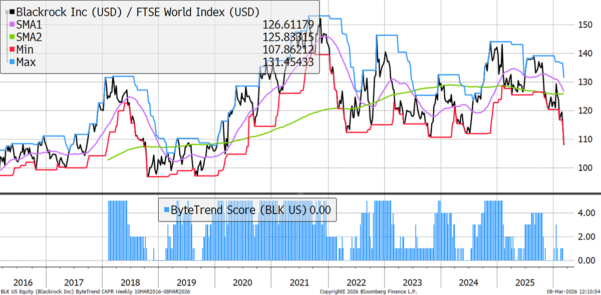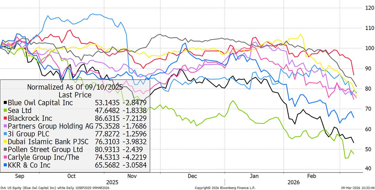 US passive investing and asset management giant BlackRock is heavily exposed to private markets (PE and private credit), which offered higher fees but are now seeing outflows, redemptions, and negative revaluations. With global stockmarkets falling, weak US jobs data, and growing nervousness about the duration of war, its share price is a natural expression of market mood.