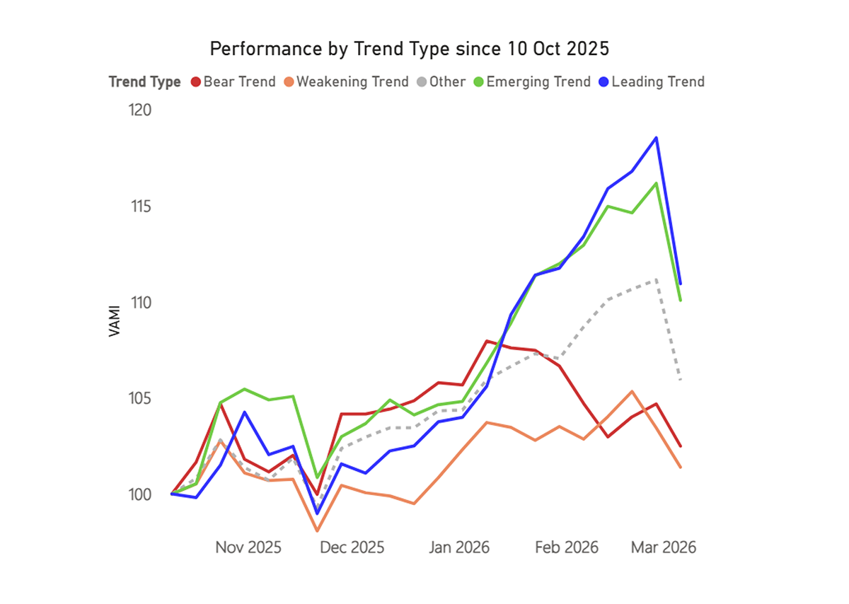 Starting last October, the trends by strength are grouped in the order you might expect to see. The leaders are still up the most, and the weakening and bear trends have performed the worst.