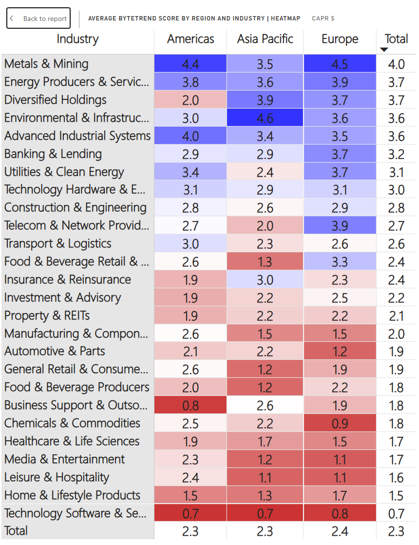 We are pleased to share the GTI 200 spreadsheet. Download the spreadsheet below to view the CAPR and local currency scores, and more, for the world’s largest 200 stocks. Have a look at the different groups and the main list “All stocks”. The Insights tab is interesting, and don’t forget to expand the columns by clicking on the “+” at the top of the page if you want to see more trend data.