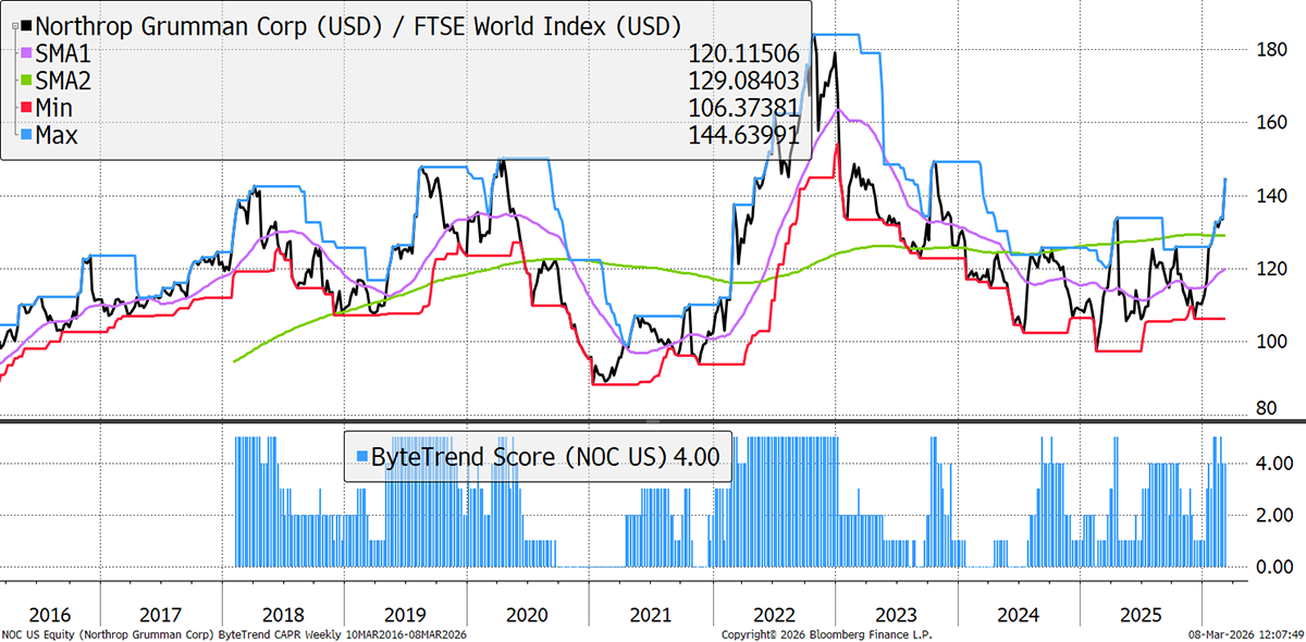 NOC has lagged the broader defence theme, but even the relative losers in defence are winning now. Its backlog reached record levels, as with most of its peers, and it is expanding production capacity to meet it. Among their offerings, their B-2 stealth bombers and missile defence systems have been most prominently in the headlines this week.