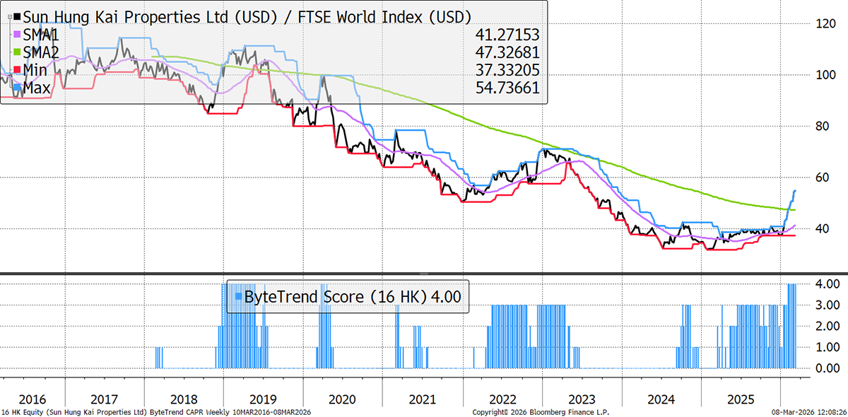 Sun Hung Kai is Hong Kong's largest property developer, building and selling high-end homes, offices, shopping malls, and industrial spaces. It also earns a steady rental income from its vast portfolio and operating-related businesses, such as telecom, hotels, and transport. It just posted 17% profit growth.
