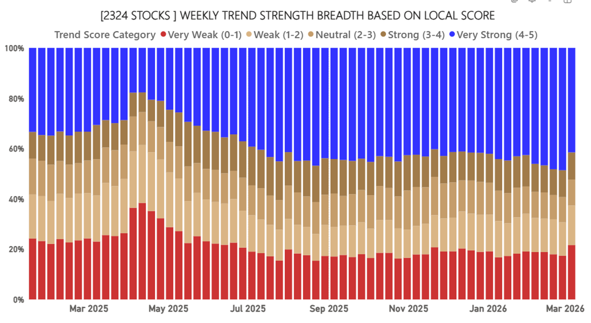 The breadth is now weakening as the red bear trends grow and the blue strong trends retreat. This data is as of Friday, and it would be even worse today.