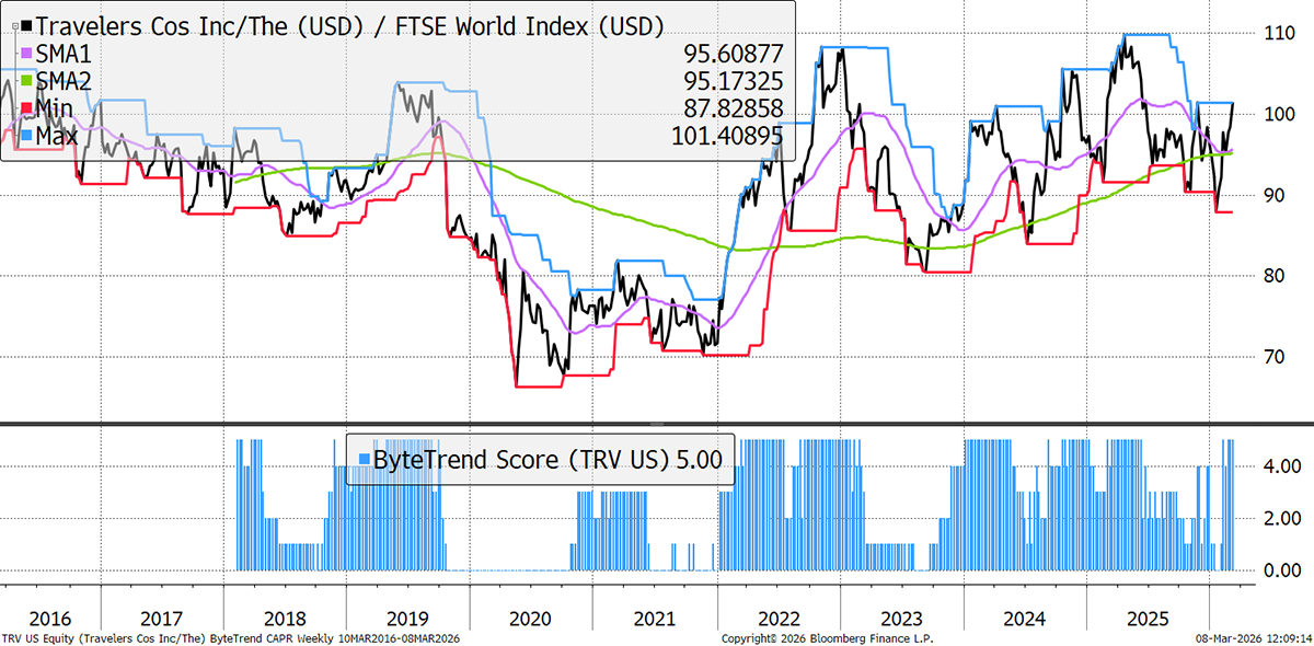 Travelers Cos is a leading US property and casualty insurer. In Q4 2025, it reported net income up 20%, driven by improved underwriting margins (a combined ratio of 82.2%); its fifth consecutive quarter below 85%. It also benefitted from lower catastrophe losses and higher investment returns from its investment portfolio, as higher interest was paid on the bonds it holds.