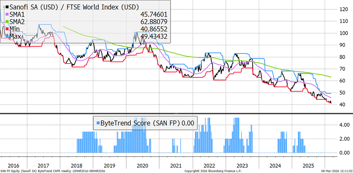 Despite the broader strength in healthcare, Sanofi is weak. This is due to pipeline setbacks like the US FDA’s rejection of tolebrutinib (its Multiple Sclerosis drug) over liver risks, which have dampened long-term growth expectations. Recent results have been strong, but pharma is reliant on strong replenishment of drug portfolios, and that is the key concern.