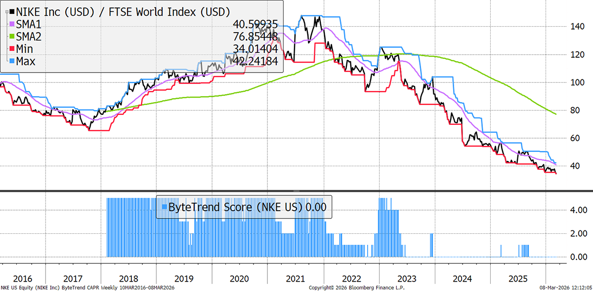 Nike’s attempted turnaround under CEO Elliot Hill is proving difficult. Rivals like On, Hoka, and Asics continue to take share in its running shoe territory, while Nike was focused on fashion. This challenge to the beating heart of its brand – performance shoes – threatens to undermine its powerful hold on global consumers, and its financial performance reflects that, with no growth and falling gross margins.