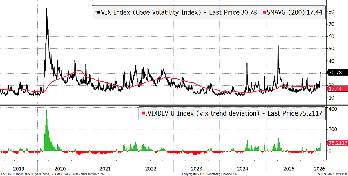 The VIX has jumped again over the weekend, but it is still below the yen rally in 2024 and the tariff crash last year. The risk is that it continues to rise.
