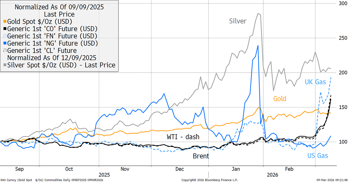 Oil prices in the US (WTI) and globally (Brent) have risen together, yet natural gas prices have diverged significantly. Gold and silver frame the scale of the moves over the past six months.