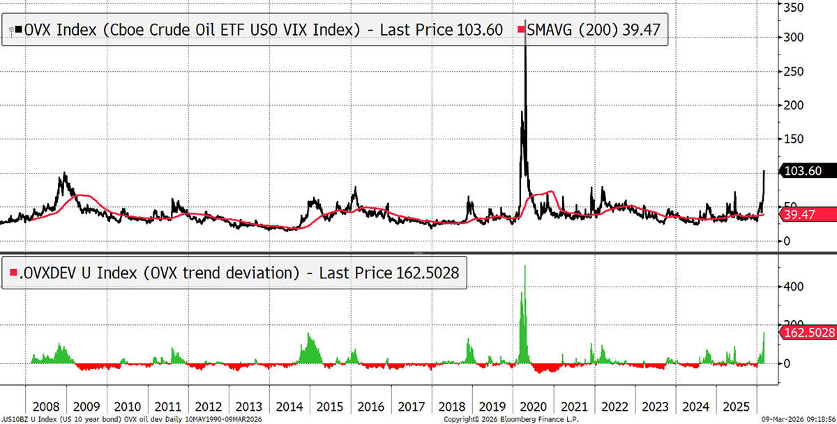 Oil options highlight the extent of the uncertainty. OVX is already higher than in 2008, but below the Covid shock, when prices collapsed.