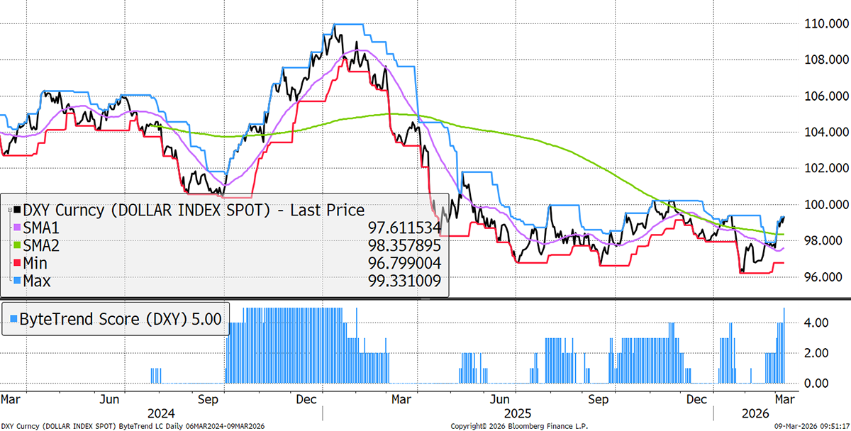 The World Index drops to a ByteTrend Score of 2 in USD. It is not just an oil shock, but a break in the bond market, delaying rate cuts. Higher inflation expectations, mayhem in commodities and shipping, and, to add to that, a break in private markets.