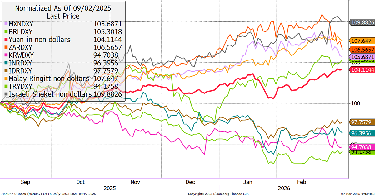 The Israeli Shekel is the strongest currency. Mex has turned down along with the Rand. Chinese Yuan is strong. Generally speaking, EM FX is doing well.