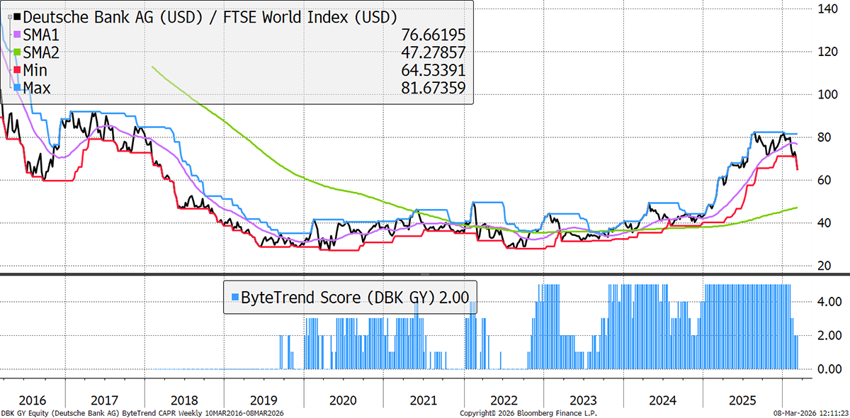European banks have fared worse than their American peers, as the economic impact of war and high oil prices is greater in Europe due to the proximity and reliance on Middle Eastern gas. High exposure to commercial real estate remains an underlying concern for Deutsche, but its financial performance has been strong in recent years, which explains its healthy outperformance until December 2025.