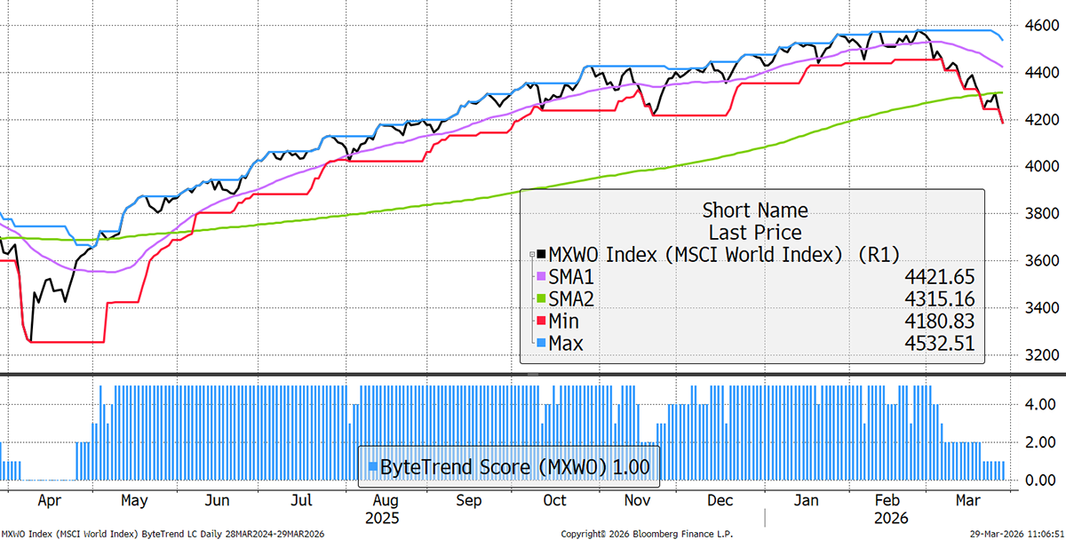 The World Index maintains a ByteTrend Score of 1 in USD. To get a score of 0, the 200-day moving average needs to turn down, which, if weakness persists, will happen soon.