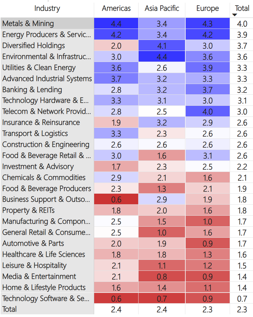 In relative terms, a number of other industries picked up last week, notably defensive sectors such as Utilities, Insurance, Telecoms, and Banking and Lending. On the downside, Advanced Industrials weakened further, as they are most sensitive to the refined products, gases, and other chemicals required for complex industrial processes. Technology Hardware maintains its strength as semiconductors remain strong.