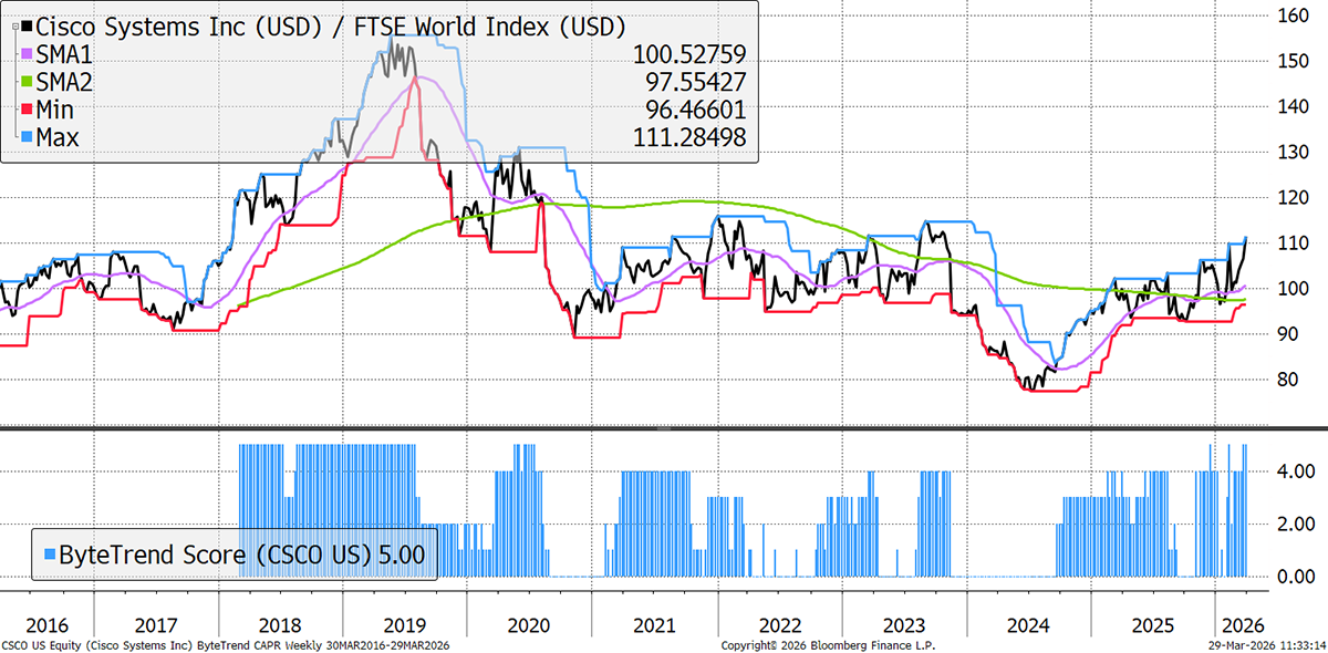 These stocks are trading at the 30-week CAPR highs with a ByteTrend Score of 5. All charts shown are CAPR rebased to 100.