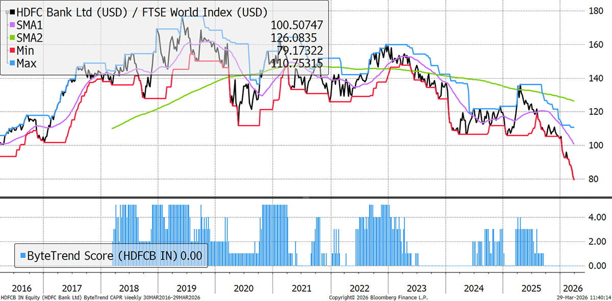 India has been weak for months. HDFC is India's largest private-sector bank by assets and market cap. The shock resignation of Chairman Atanu Chakraborty, citing “values and ethics” issues, is one factor creating fear, while three senior staff in the UAE have been fired for their association with Credit Suisse’s AT1 bond mis-selling scandal. It is also suffering from bloat and complications following its large 2023 merger.