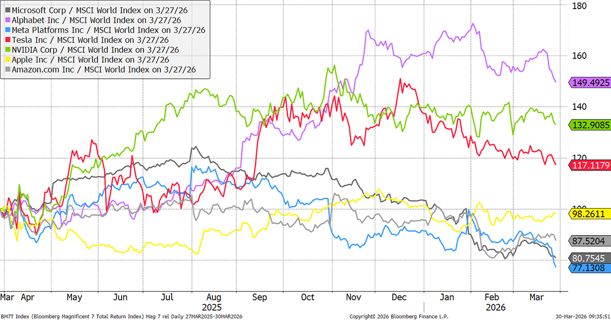 Over the past year, the Magnificent 7 stocks have cooled. Four have lagged the world, and the leaders have now turned down. Continued weakness will become a drag on the S&P500.