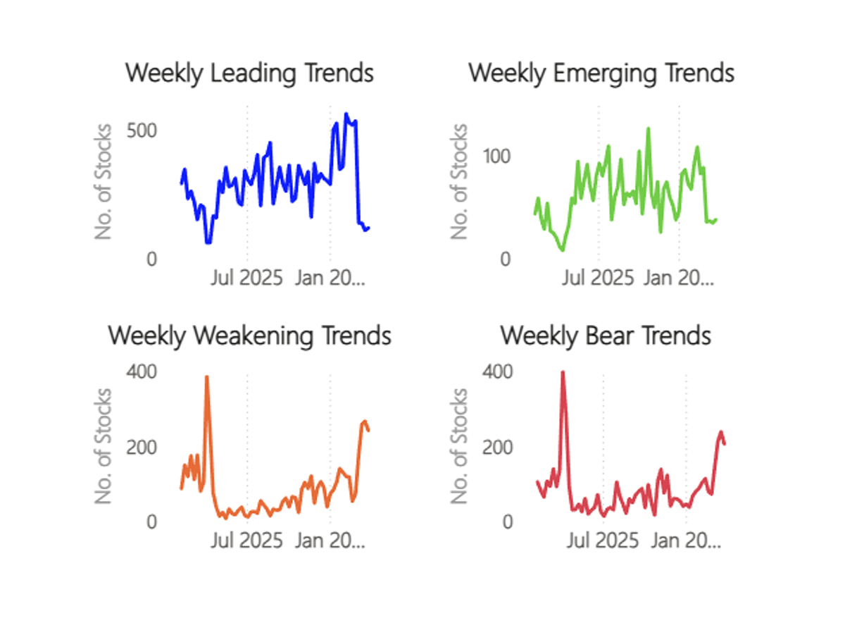 The number of new price highs remains weak, but is fewer than last week. The number of bear trends is also slightly fewer than last week.