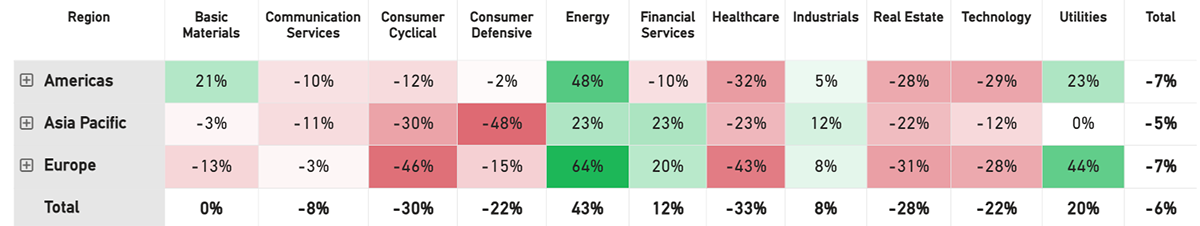 Telecoms had a good week. These are the surprise defensive stocks, likely because they are heavily underowned despite being rate-sensitive. Clean Energy is buoyant alongside a rising oil price. Technology Hardware is off its peak, which was extreme. Home and Lifestyle (luxury) is weak alongside REITs, where the recovery has been postponed due to the higher rates outlook.